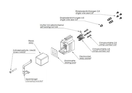 This connector kit provides you with the necessary accessories for your watertight socket for MRS-Relays (Housing 30 x 30 x 40 mm). The package includes not only the robust socket but also the matching crimp contacts. The clamping bracket (Height: 40 mm), the sealing mat as well as the individual wire seals ensure tightness.