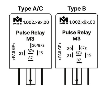 Pulse relays M3 are used when loads are to be switched on or off for a defined time. Please specify the desired impulse time when ordering. Circuit diagram S1 and S2: operating voltage is applied to terminal 30. If the voltage is set at Terminal 15, the relay will immediately pull in for the specified time and then fall off again. The duration of the control signal has no effect on the output pulse duration (i.e. the relay is not retriggerable).