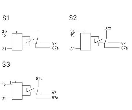 Circuit diagram S3: Operating voltage is applied to terminal 87z. If the voltage is set at Terminal 15, the relay will immediately pull in for the specified time and then fall off again. Circuit diagram S2 and S3: The contacts are separate from the control and can therefore be used in links. In this variant, the relay contact is completely potential-free and thus capable of switching alternating voltage. Housing forms can be found in the section housing and basic body.