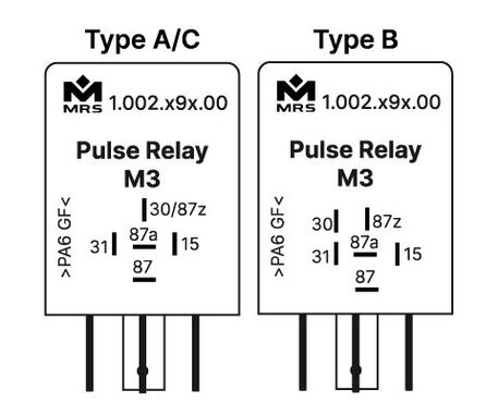 M3 impulse relays are used when loads are to be switched on or off for a defined period of time. When ordering, please indicate the desired pulse times. Circuit diagram S1 and S2: Operating voltage is applied to terminal 30. If voltage is applied to terminal 15, the relay picks up immediately for the specified time and then drops out again. The duration of the control signal has no influence on the output pulse duration (i.e. the relay cannot be retriggered).