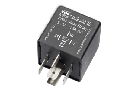 Our solid state relay has a high capacitive and inductive peak current capacity and is perfectly suited for switching resistive and inductive loads. Compared to mechanical relays, the solid state relay has no moving contacts so it is maintenance and wear-free with a silent activation. The current feedback via the additional 5th pin offers useful diagnostic output. Due to the compact size and the connector, the relay is compatible with conventional ISO mini relays. The solid state relay can be ordered with positive or negative control.