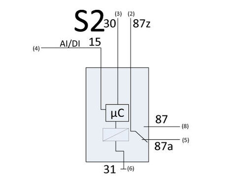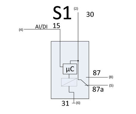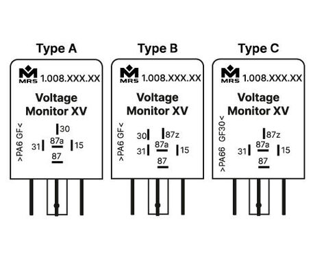 The voltage monitor switches loads off when the voltage signal connected to terminal 15 drops below or exceeds a lower/upper threshold voltage. The standard lower/upper threshold voltages for 12 V applications are 11.5 V/12.5 V and 23.5 V/24.5 V for 24 V applications. Lower/upper threshold voltages can be customized on request.